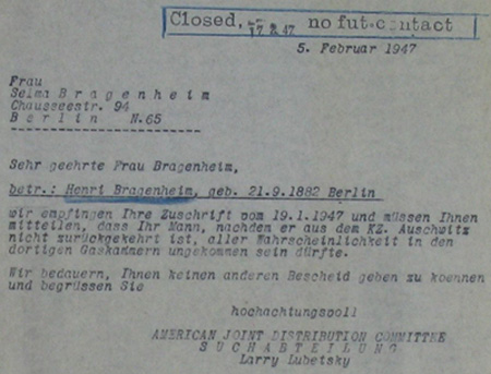 Von 1942 gibt es in den Arolsen-Archiven einen Brief, in dem gegen den Abzug der